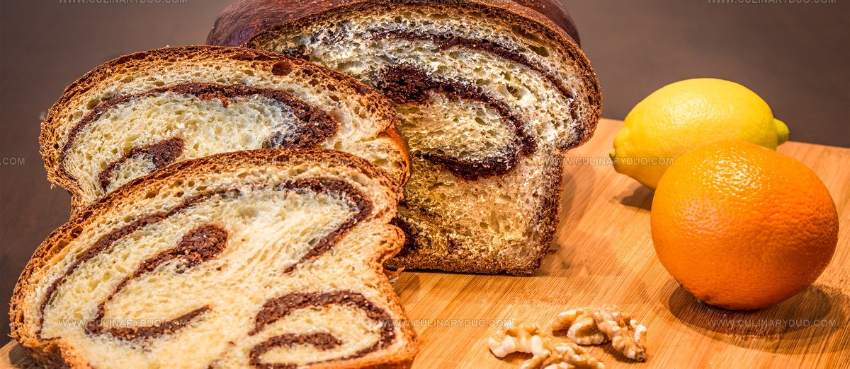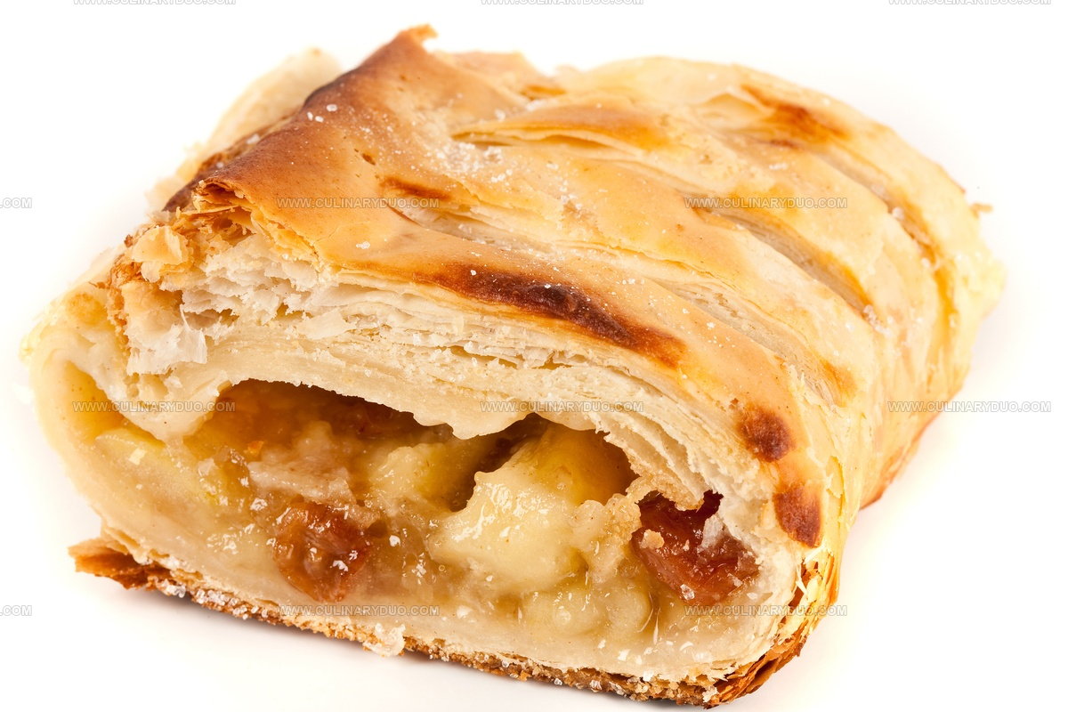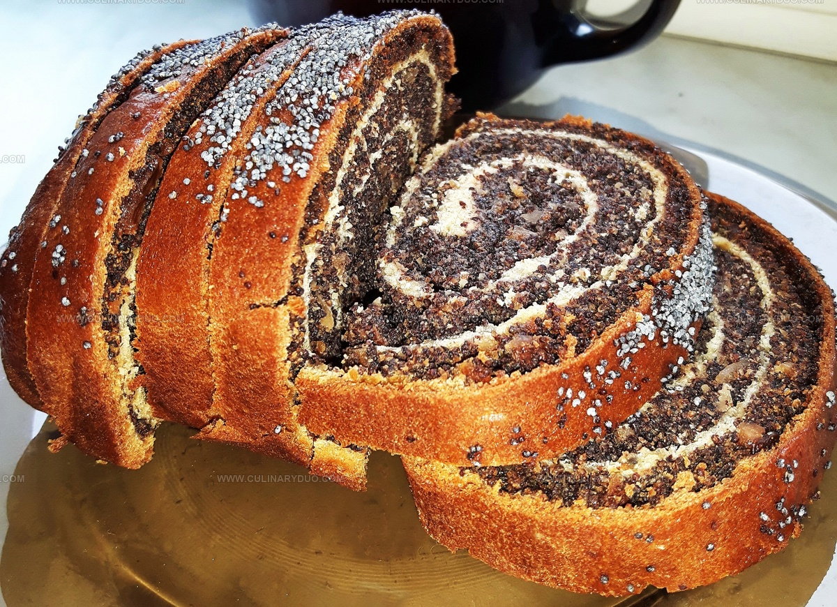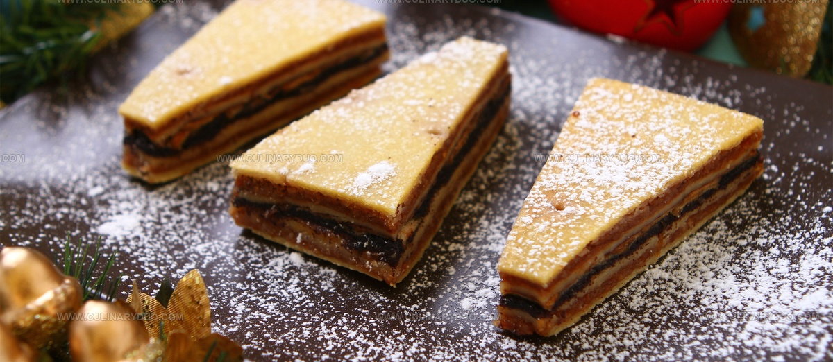 Walnut, apple, plum jam, and poppyseed layers create a complex texture and taste profile inside delicate pastry.