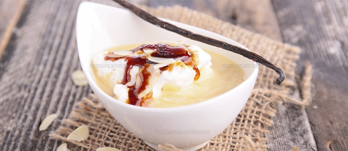 French culinary experts craft these desserts by carefully poaching soft meringue spheres in creamy custard bases.