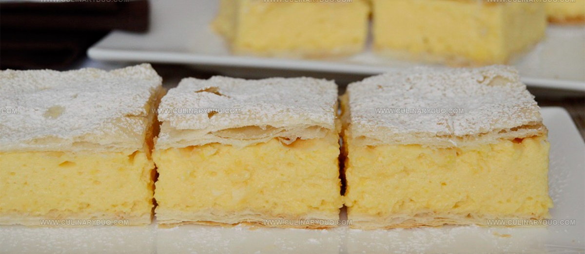 Hungarian bakeries craft these rectangular treats with delicate, light cream carefully nestled between flaky golden pastry sheets.
