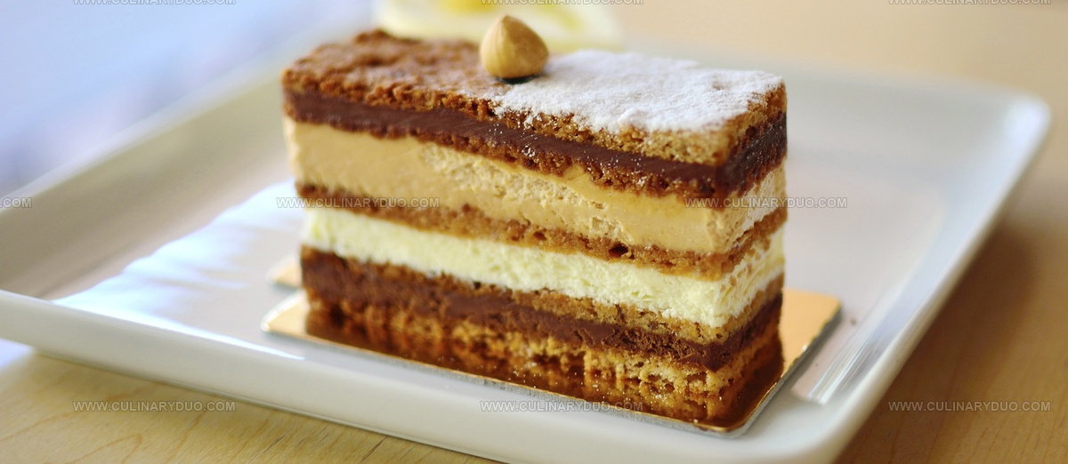 Opera gateau mesmerizes dessert lovers with its intricate layers of almond sponge cake, coffee buttercream, and rich chocolate ganache, creating a symphony of French pastry artistry.