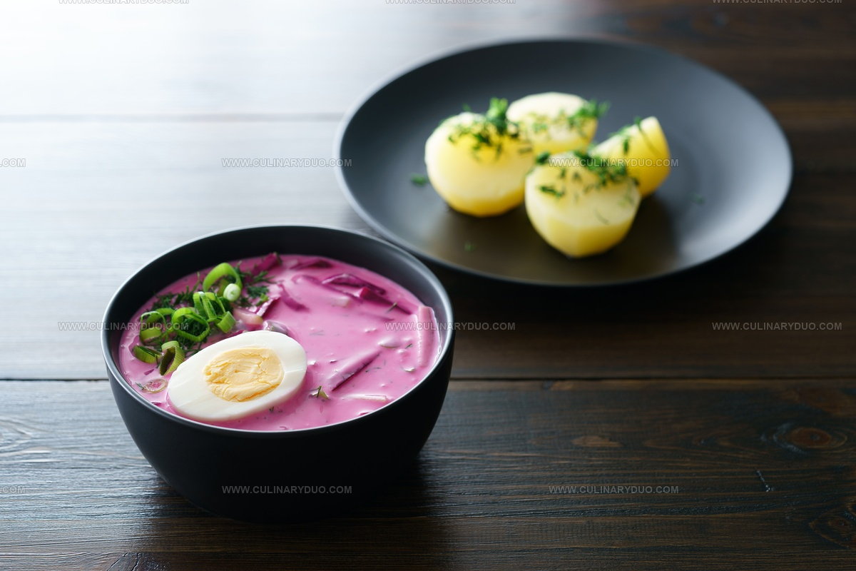 Creamy kefir or buttermilk serves as the soup's smooth base, complementing pickled or boiled beetroots' vibrant color and earthy flavor.
