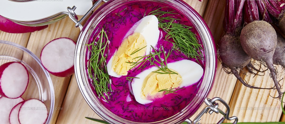 Beets create the soup's vibrant color and distinct flavor, blending seamlessly with kefir, cucumbers, and milk sausage.