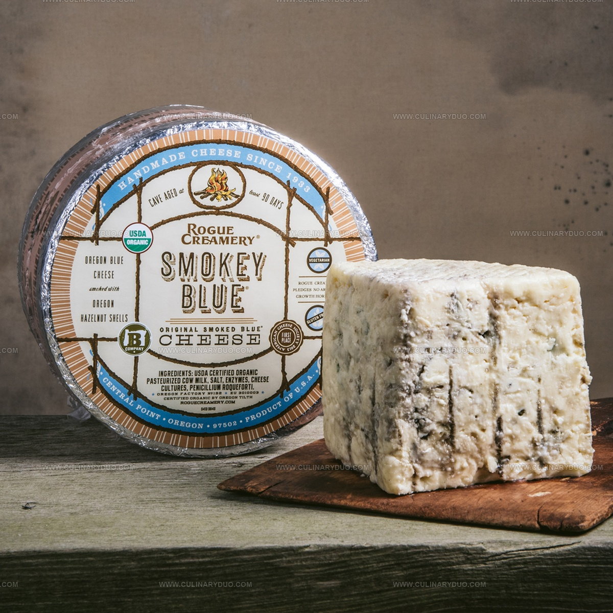 Smokey Blue represents a distinctive artisan blue cheese crafted by Rogue Creamery in Oregon, distinguished by its innovative cold-smoking process over hazelnut shells.