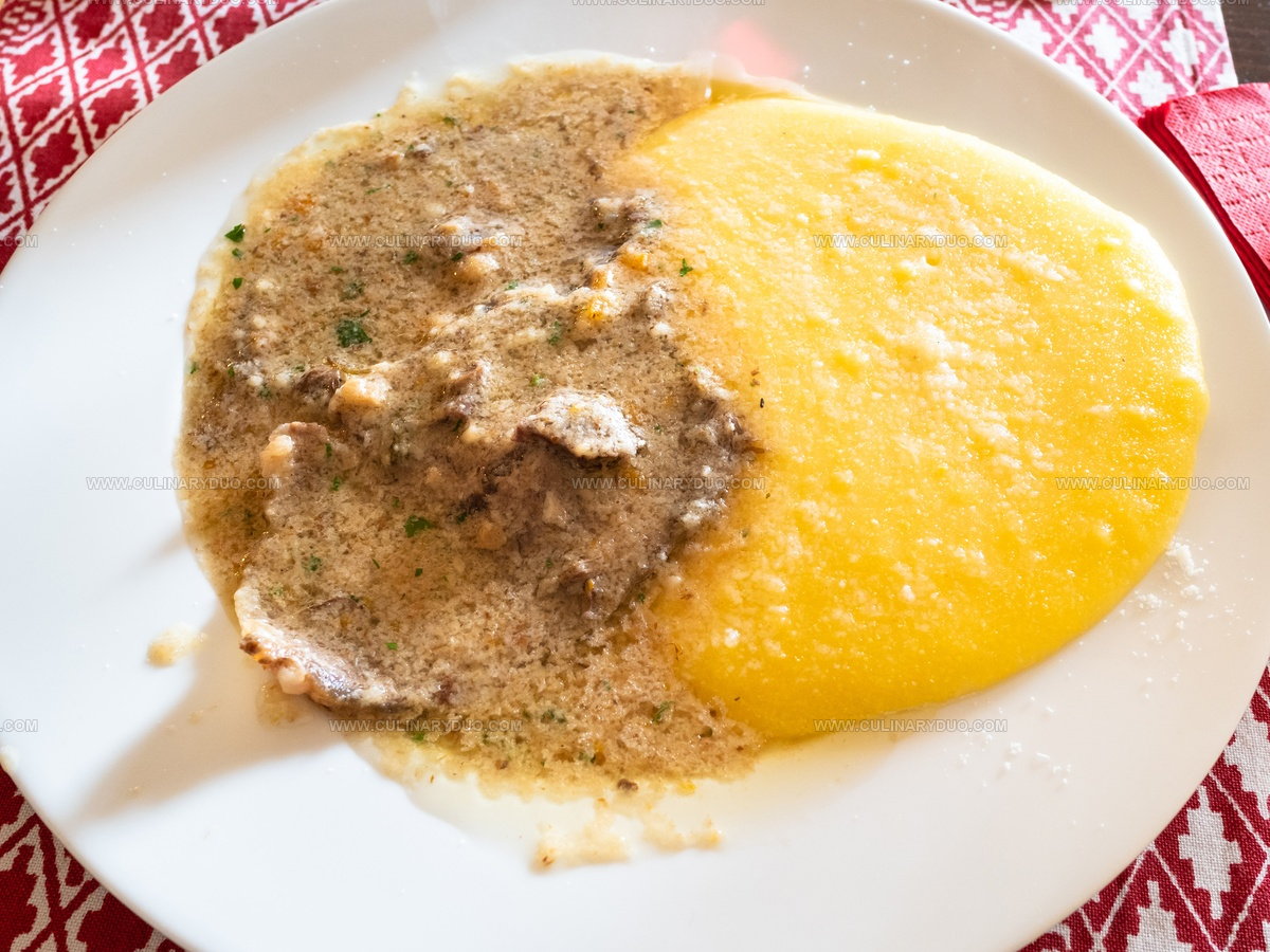 Polenta, potatoes, or bread typically accompany the dish, adding texture and complementing the meat's richness.