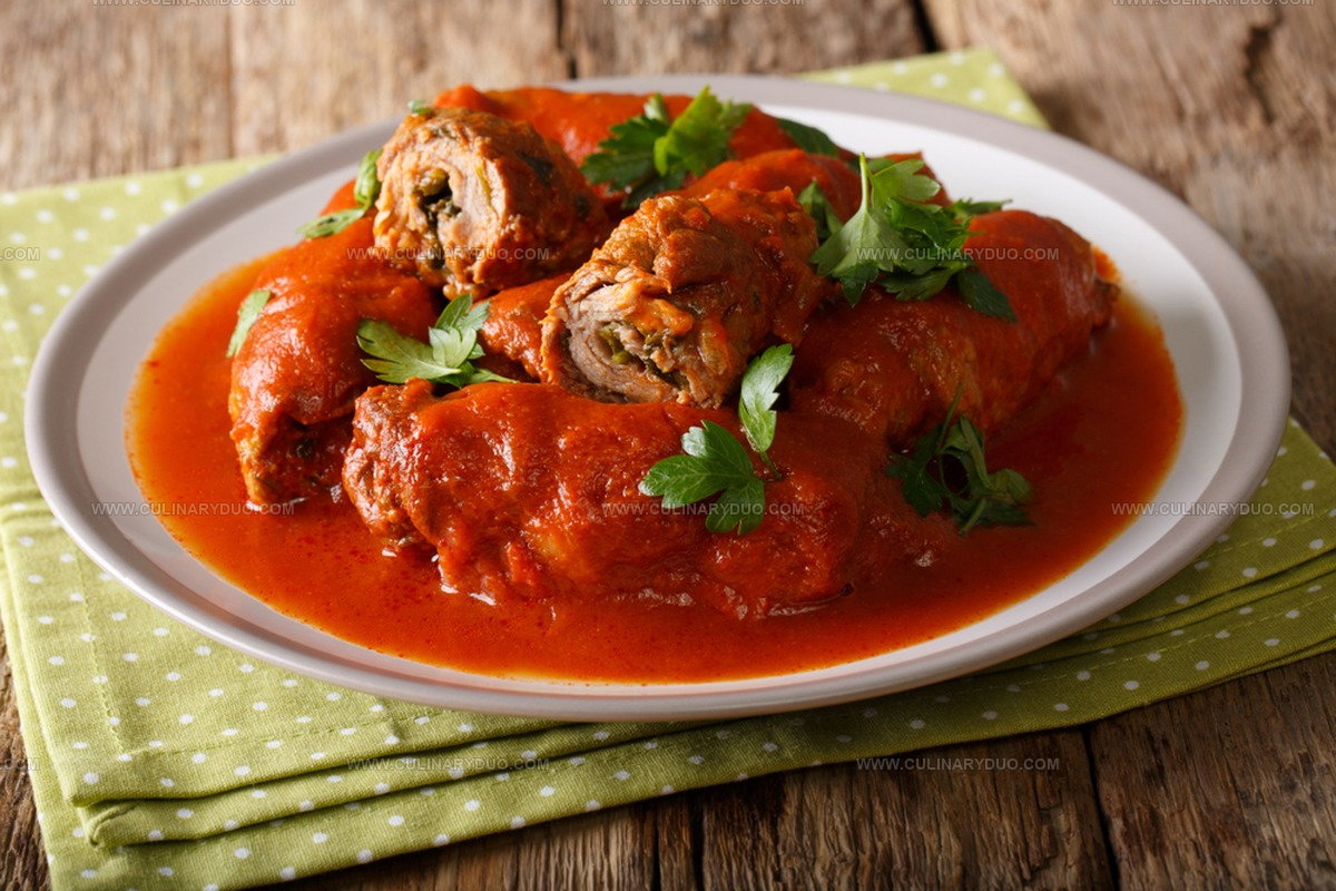 Originating in Rome, these meat rolls feature thin beef slices wrapped around prosciutto, carrots, and celery.