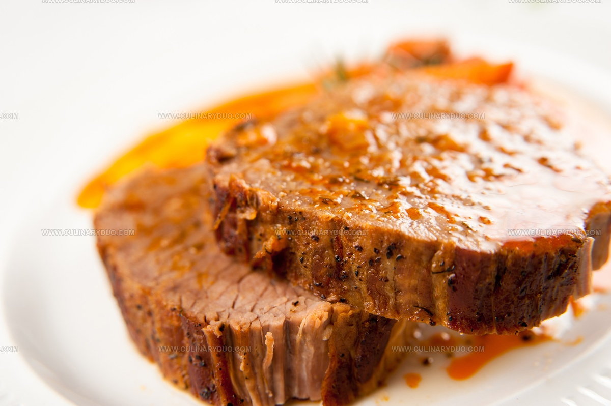 Braising liquid becomes a smooth, concentrated sauce pureed and drizzled over sliced meat.