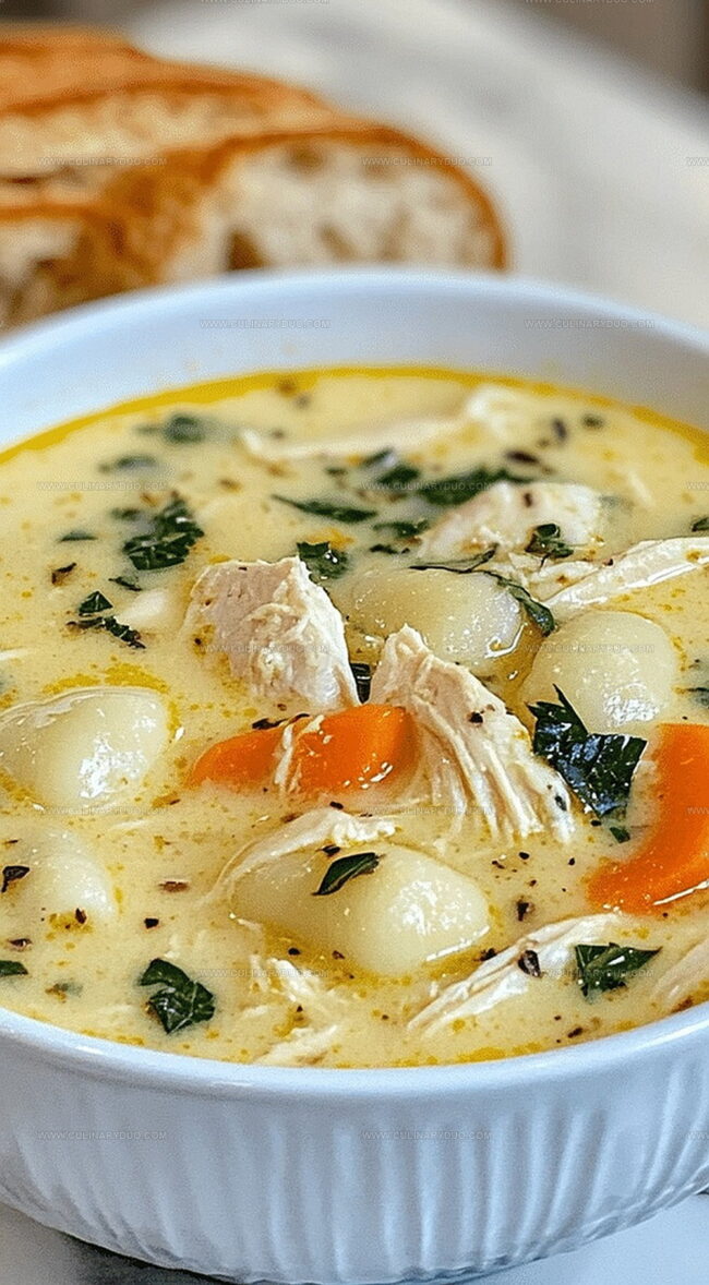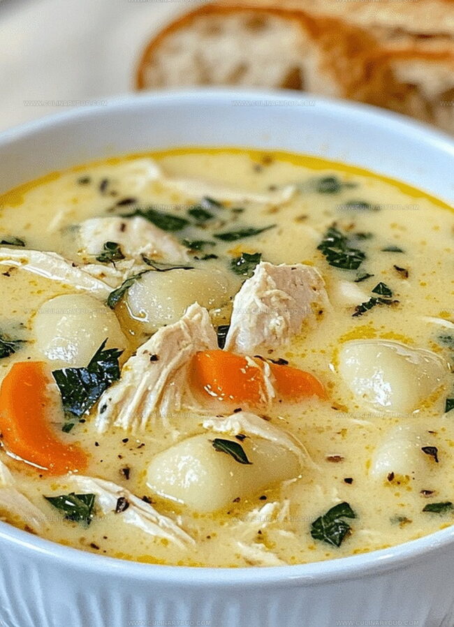 - Ladle the steaming, creamy soup into warm serving bowls, ensuring each portion captures a harmonious blend of tender chicken, soft gnocchi, and vibrant vegetables.