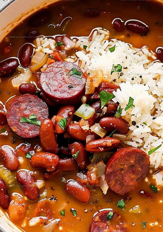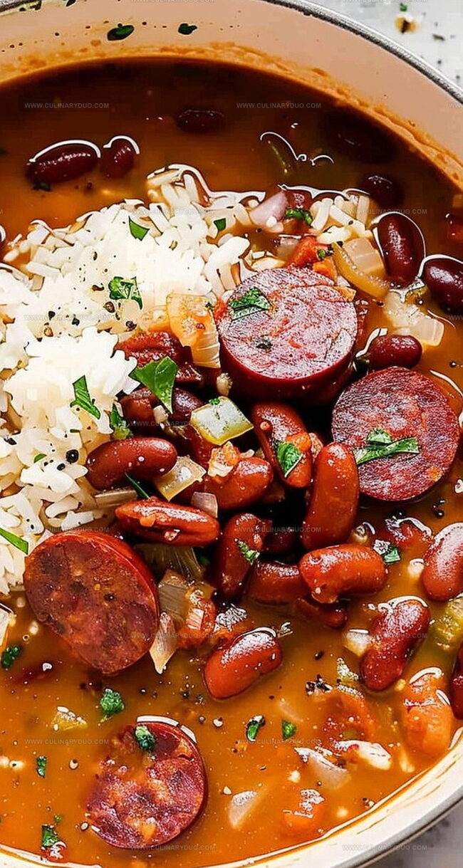 Smoky sausage links mingle with creamy red beans, creating a symphony of Creole-inspired taste.