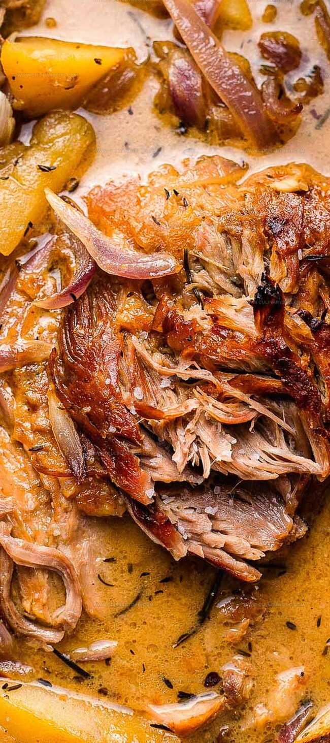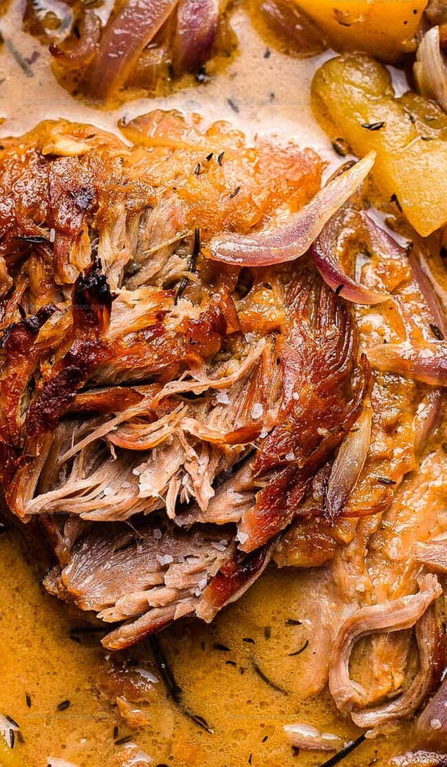 - When pork approaches fork-tender consistency, arrange sliced onions and apples around the meat. Return to oven, covered, for an additional 30-45 minutes until meat is exceptionally tender.