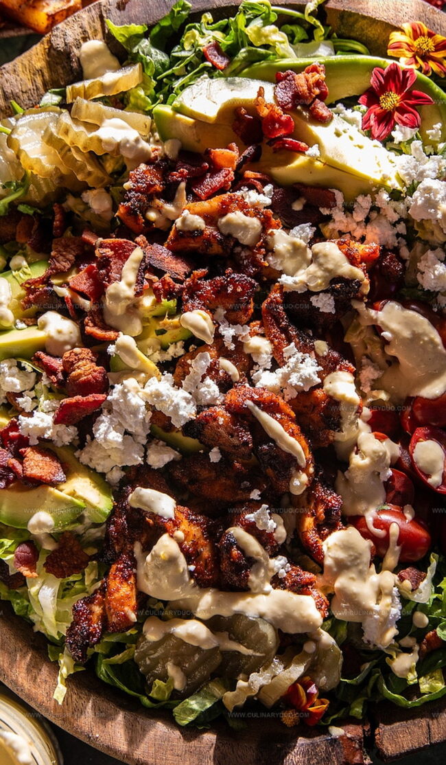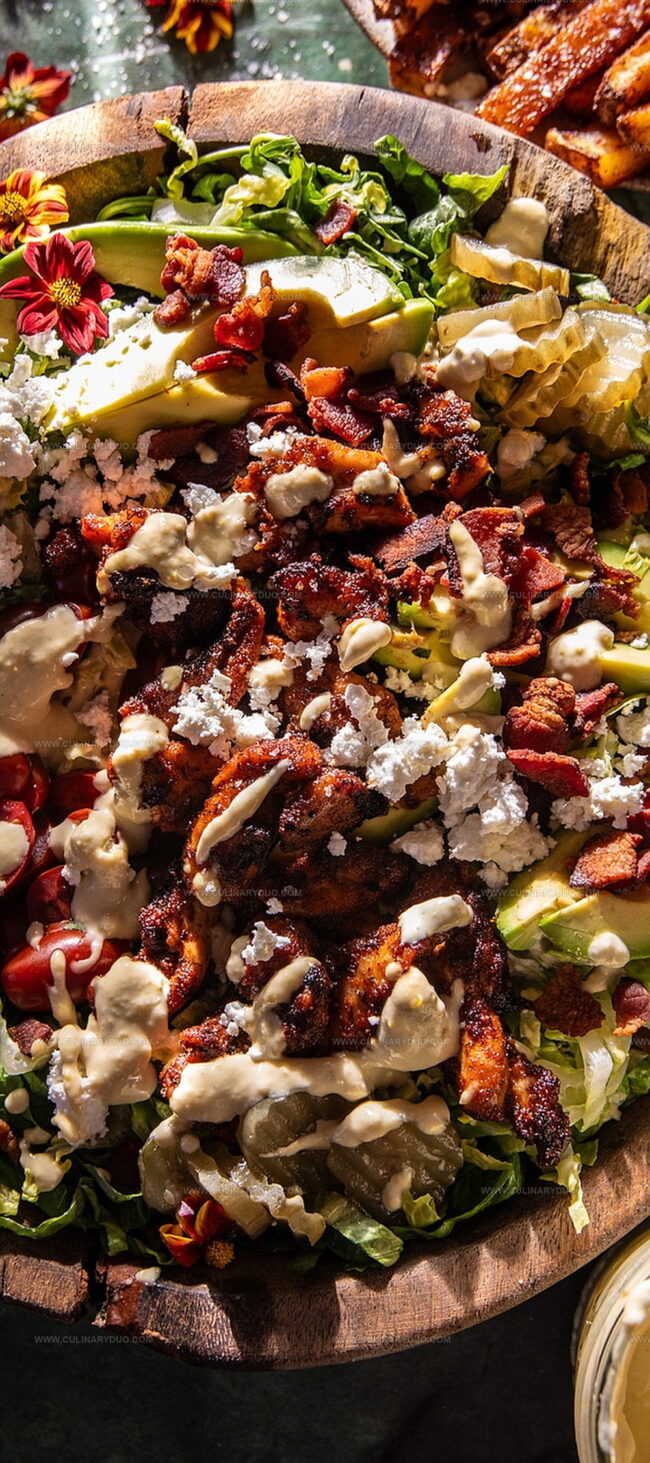 - Drizzle the prepared dressing over the salad base, then strategically layer roasted chicken, creamy avocado chunks, crumbled feta, fresh herbs, and crispy bacon pieces.
