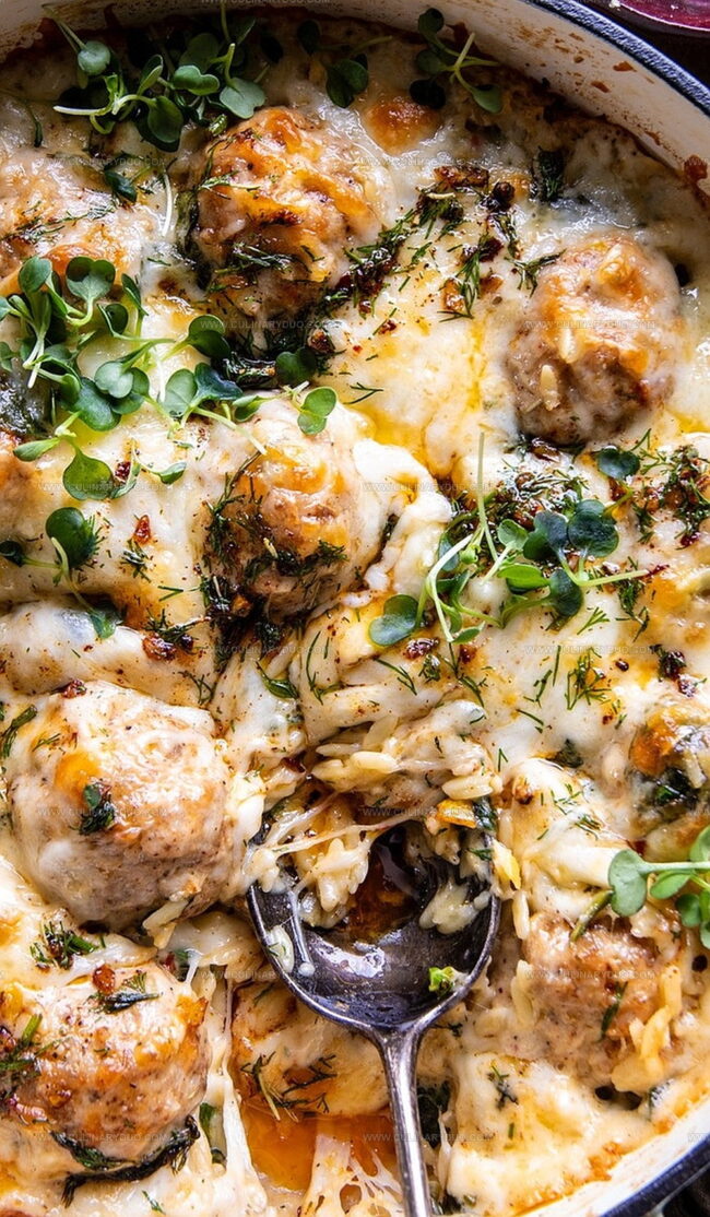 Creamy orzo provides the perfect companion to these succulent meatballs, offering a smooth and comforting base.