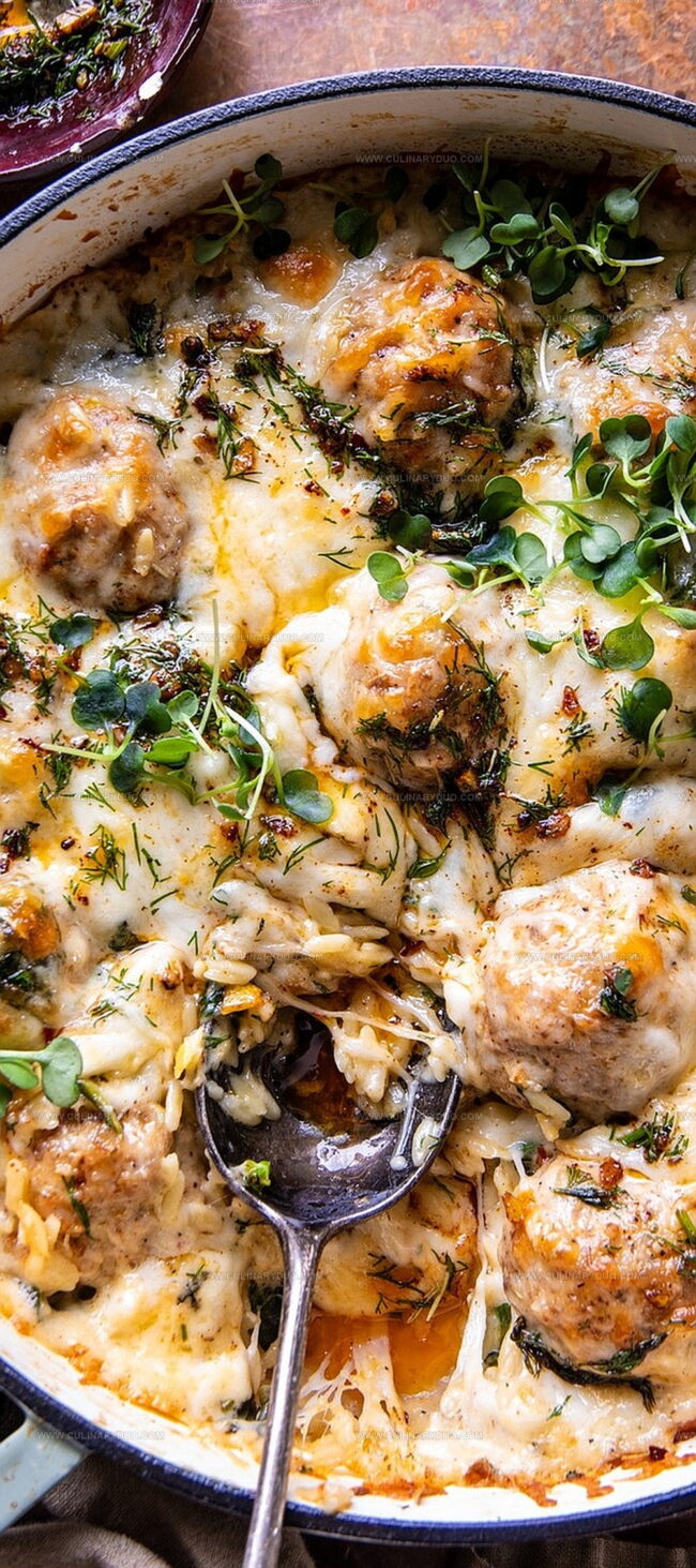 Savory Baked Lemon Rosemary Chicken Meatballs dance with creamy orzo in this Mediterranean-inspired dish. Herbaceous and zesty flavors blend seamlessly, promising a delightful meal that transports you to sun-kissed Italian kitchens.