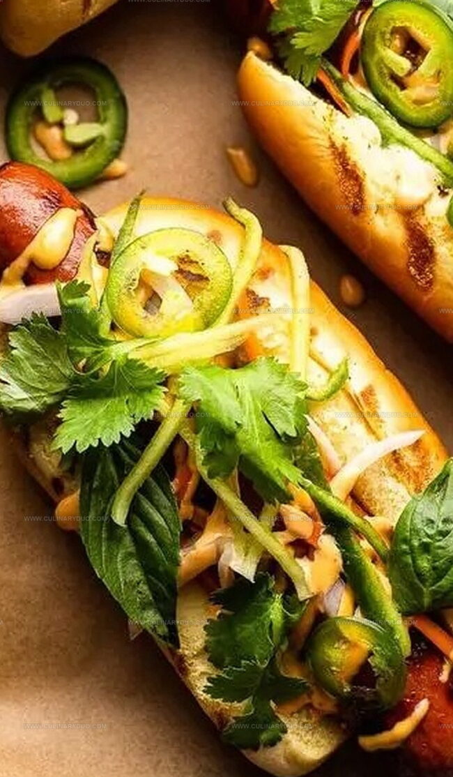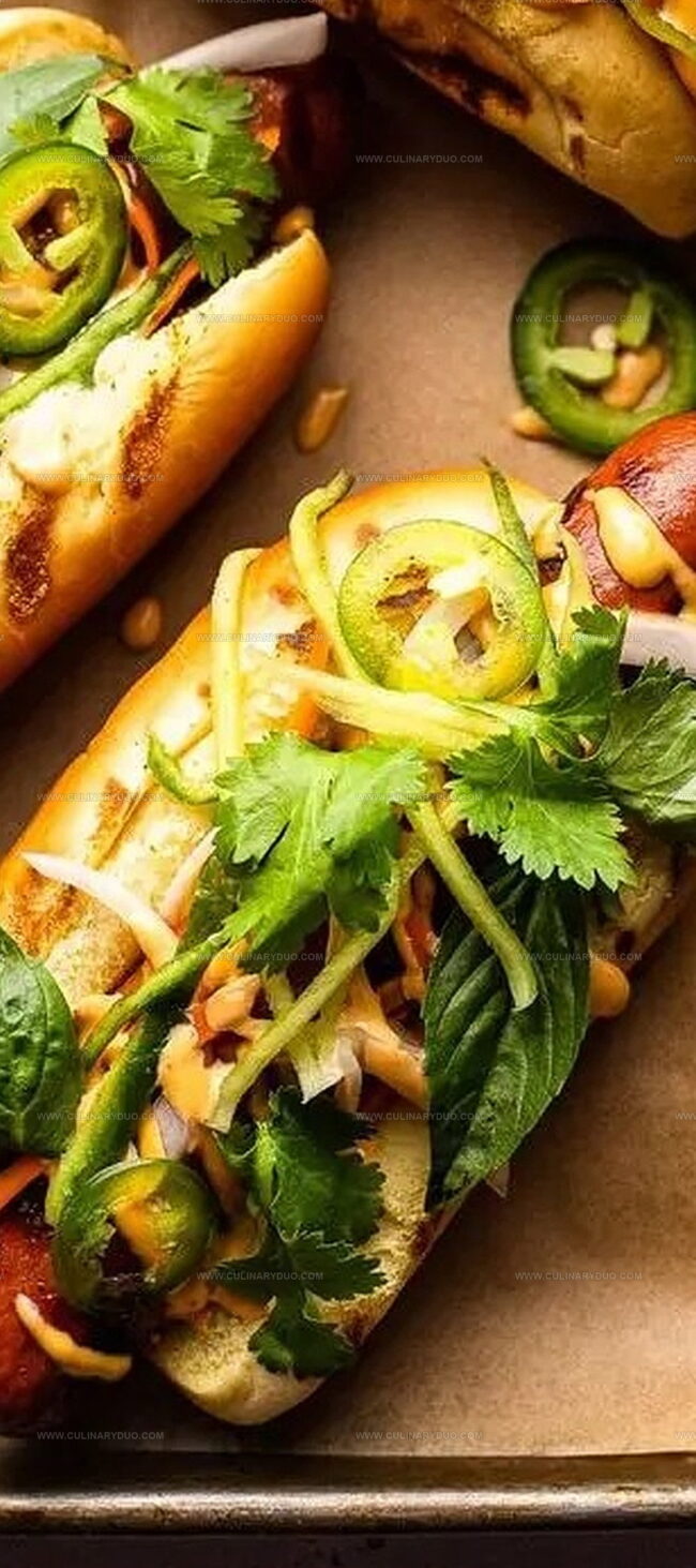 - Construct the ultimate Banh Mi hot dog by layering grilled frank in the toasted bun. Top generously with pickled vegetables, crisp cucumber shreds, fiery jalapeño slices, and fresh aromatic herbs.