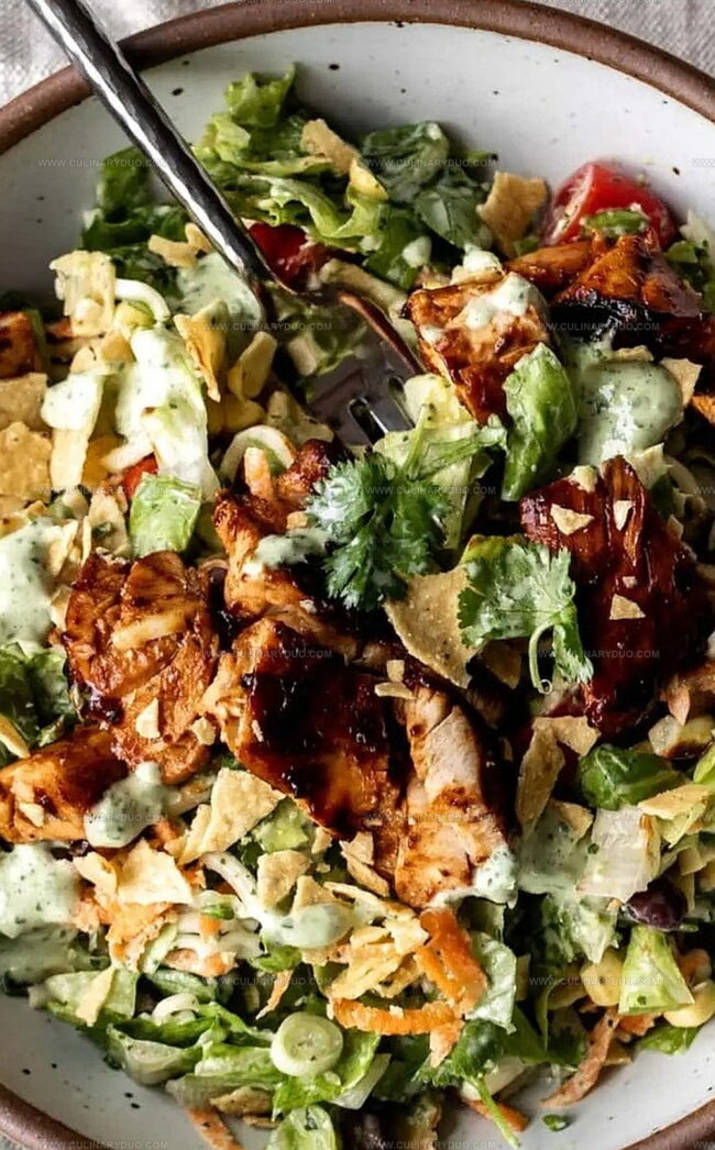 - Drizzle cilantro ranch dressing over the salad, tossing gently to distribute ingredients evenly, then crown with the BBQ chicken pieces before serving.
