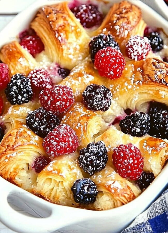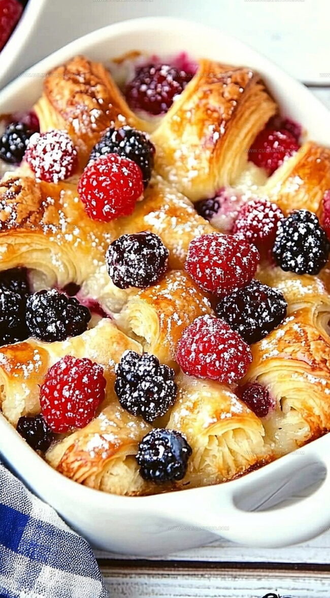 Flaky croissants mingle with vibrant summer berries in a dreamy custard mixture.