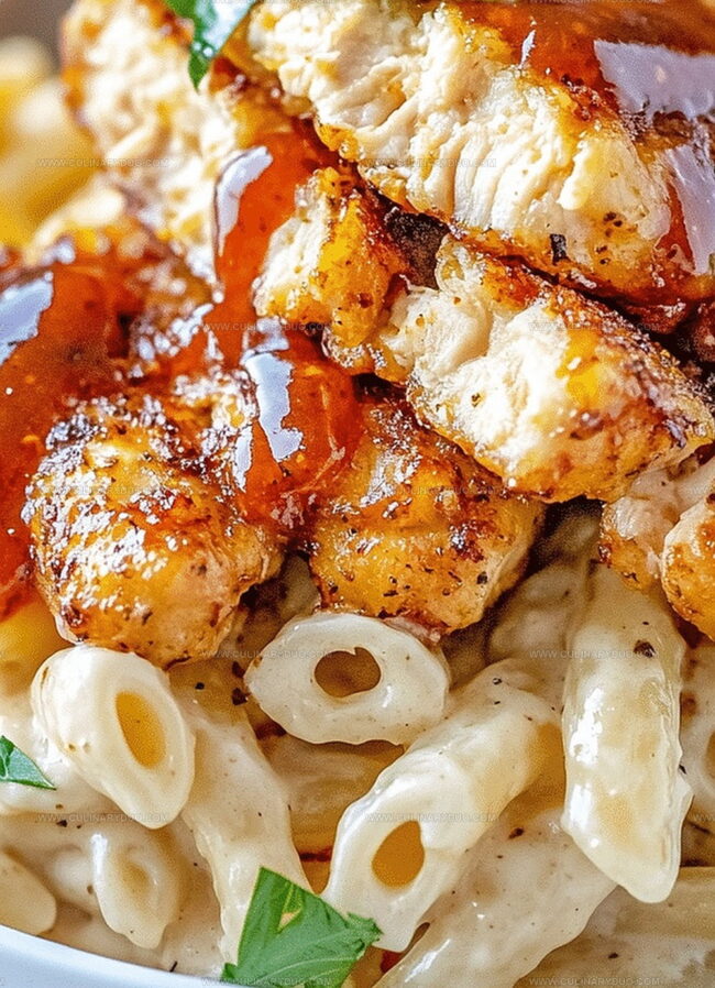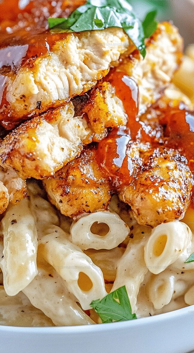 - Slice the crispy chicken into strips and arrange artfully atop the cheesy pasta.