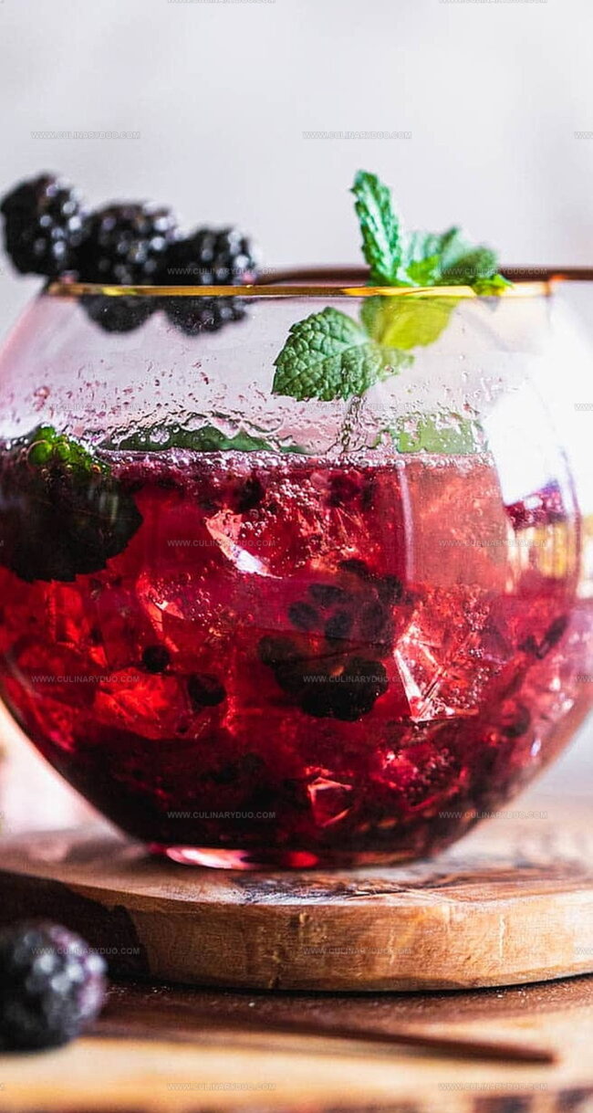 - Crush ripe blackberries, fresh mint leaves, and sugar in a rocks glass using a cocktail muddler until the sugar dissolves and the fruits release their aromatic oils.