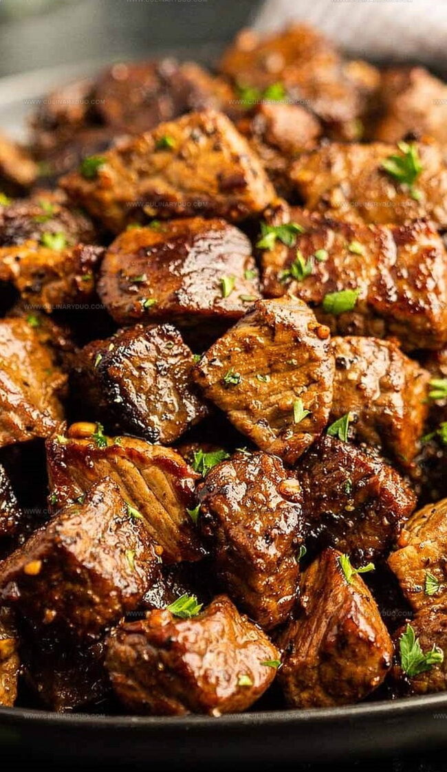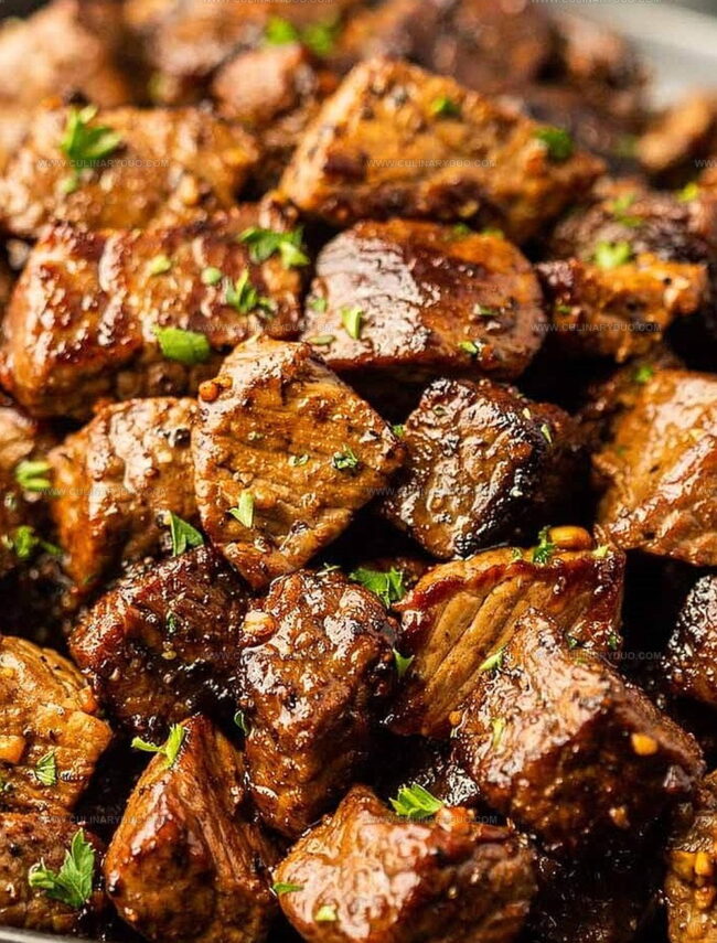 - Transfer steak bites to a serving plate, garnishing with fresh chopped parsley for vibrant color and added flavor.
