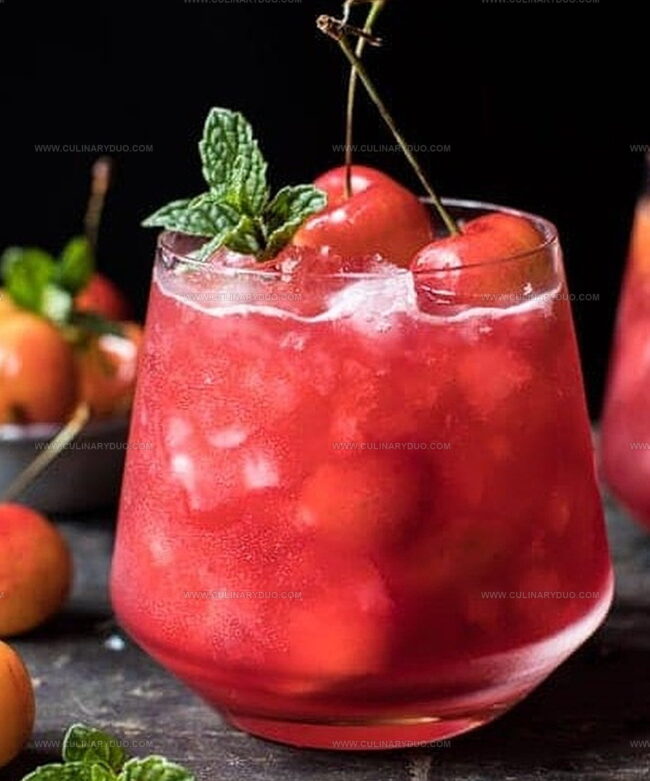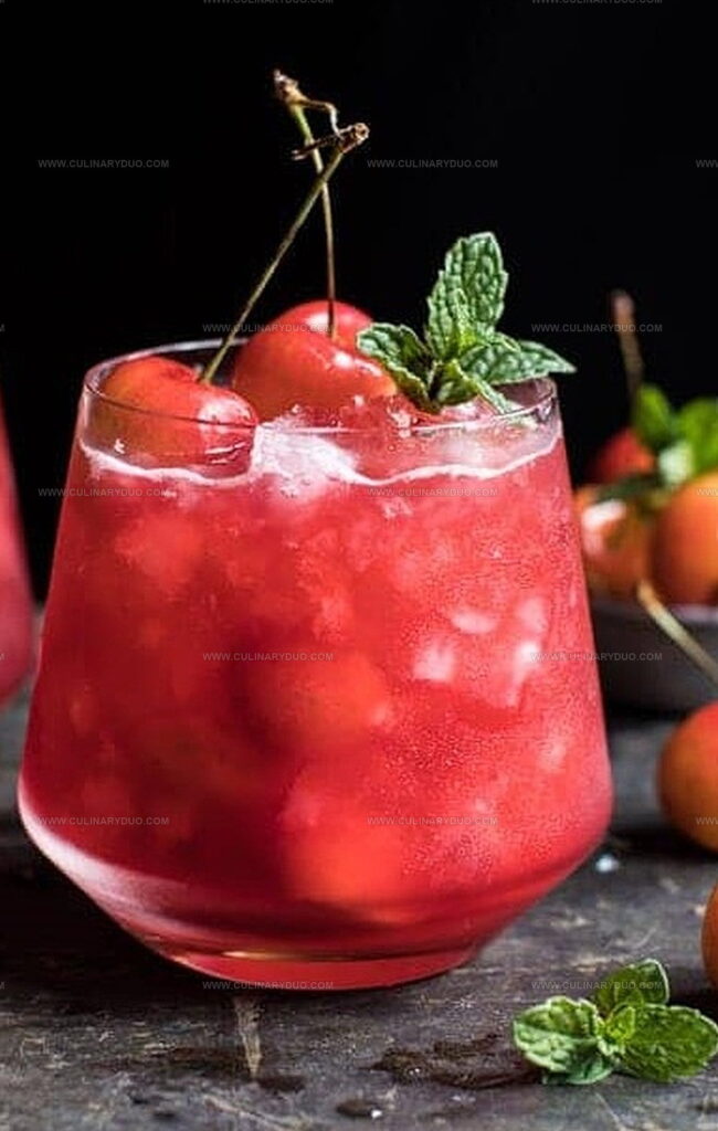 - Artfully garnish the cocktail with a few fresh mint leaves and whole cherries, positioning them elegantly on the glass rim to create an inviting presentation.