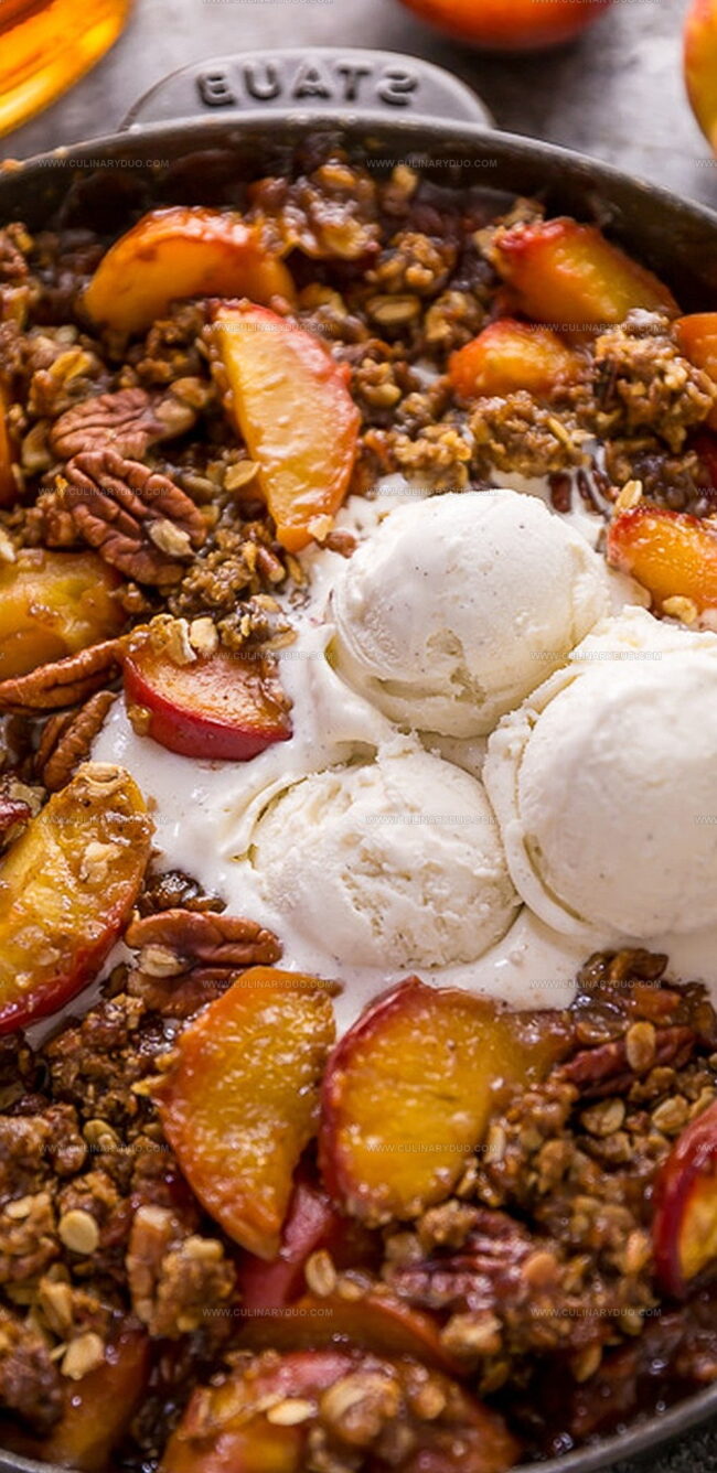 Ripe peaches burst with golden sunshine, nestled beneath a crumbly blanket of toasted pecans and rich caramel notes.