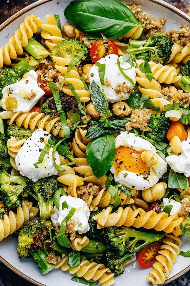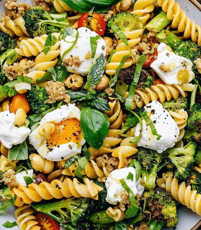 Mediterranean-inspired broccoli burrata pasta salad combines roasted vegetables, creamy cheese, and herbed dressing for a fresh, elegant meal. Summer’s perfect dish brings bright flavors and rich textures you’ll crave again and again.