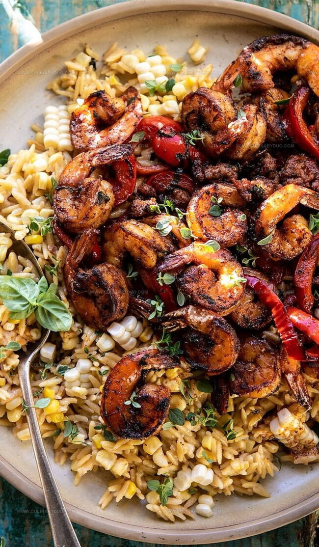 Spicy Cajun pepper shrimp dances with creamy orzo, bringing Southern comfort to your plate. Zesty flavors mingle with sweet corn, creating a bold culinary experience you’ll savor down to the last delicious bite.