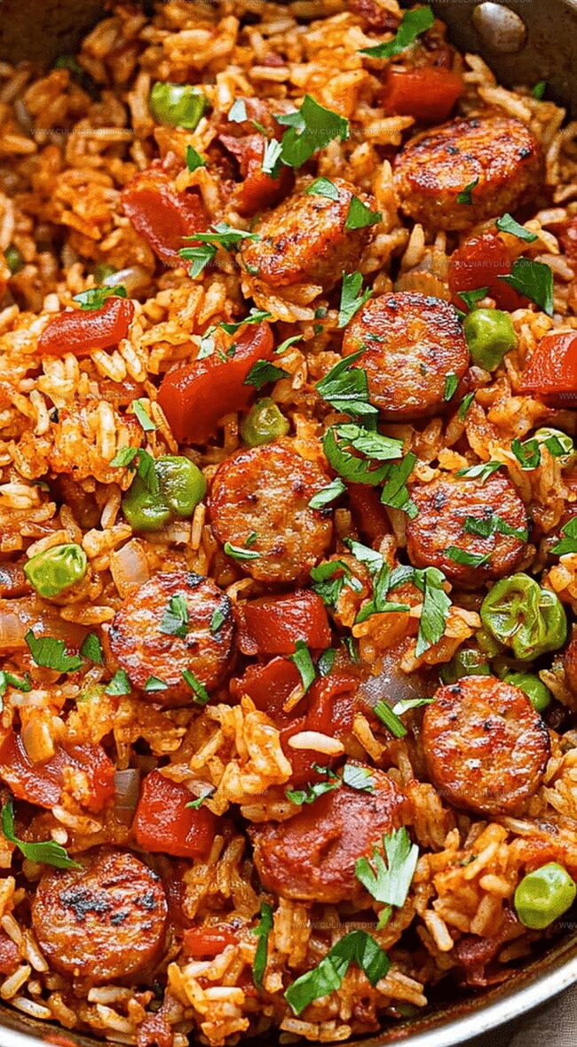 Hearty andouille sausage sizzles alongside tender rice, creating a one-pan meal bursting with bold Louisiana flavors.