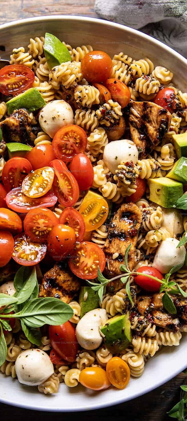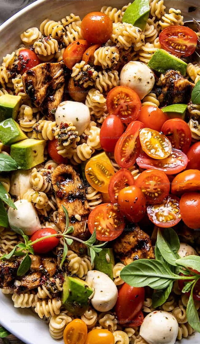 - Combine cooked pasta, grilled chicken, fresh mozzarella, ripe tomatoes, and creamy avocado in a spacious serving bowl.
