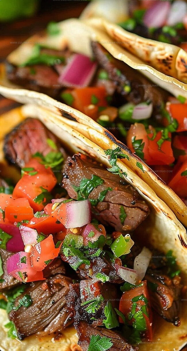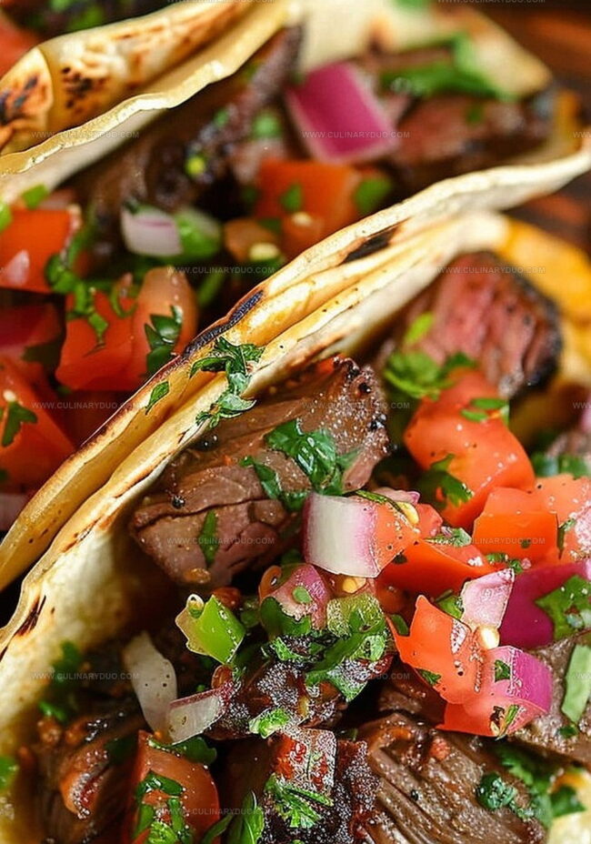 - Assemble the tacos by layering sliced steak onto the warm tortillas, generously topping with fresh Pico de Gallo.