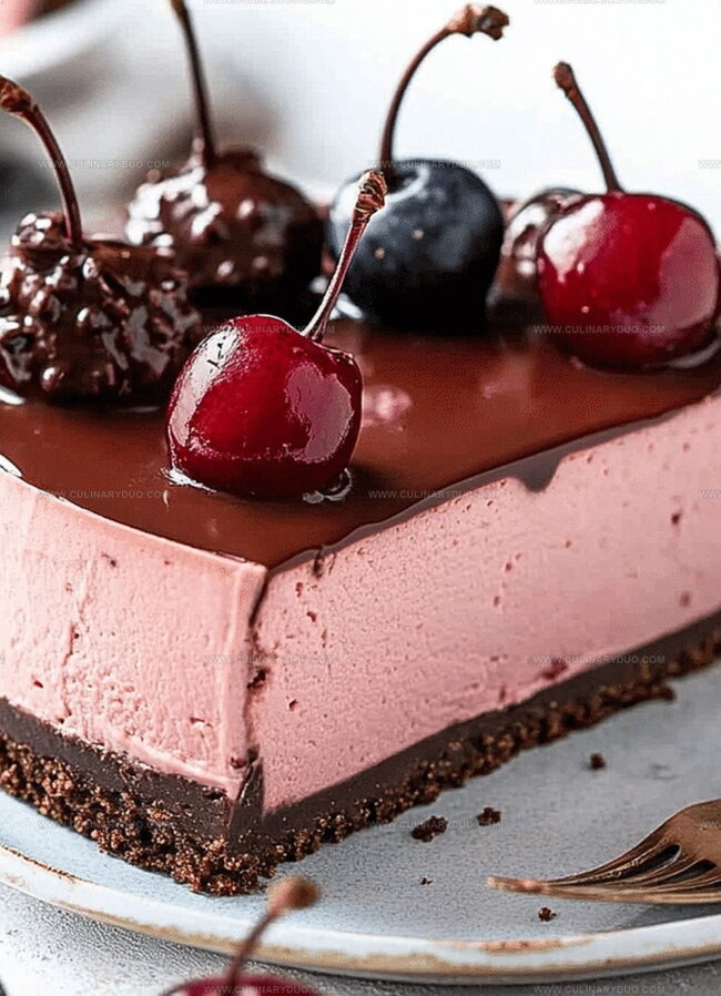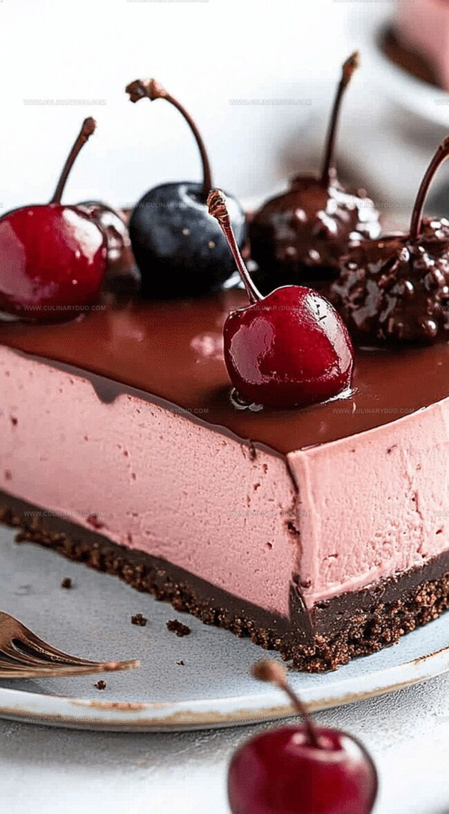 The creamy layers blend velvety chocolate with tart cherry notes, creating a dessert that feels both elegant and irresistible.