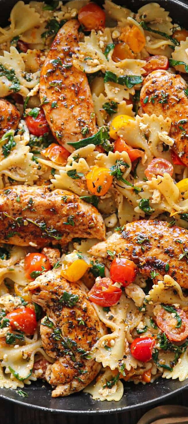 Zesty Chicken Feta Pasta with Spinach and Cherry Tomatoes Recipe