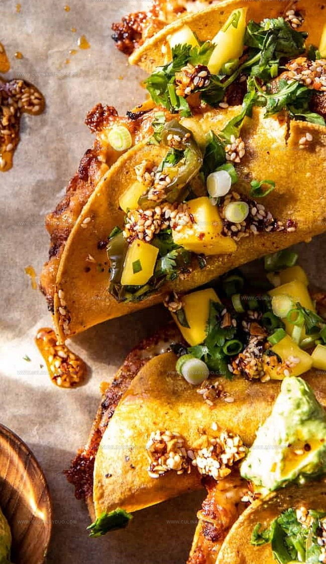 Spicy chili crisp chicken tacos bring Mexican-inspired flavors dancing across your plate with zesty mango salsa. Crispy, tangy layers of excitement promise a memorable meal that satisfies cravings and delights taste buds in one delicious bite.