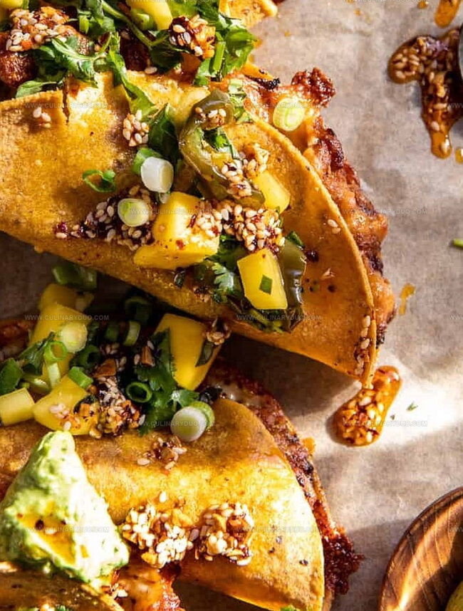 - Plate tacos and embellish with fresh avocado slices, zesty salsa, and an extra drizzle of chili crisp for heightened flavor complexity.