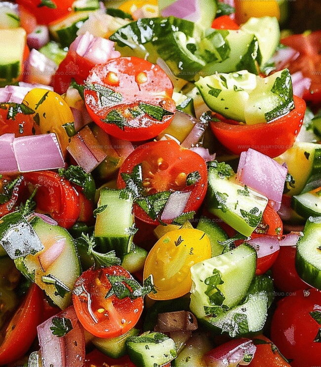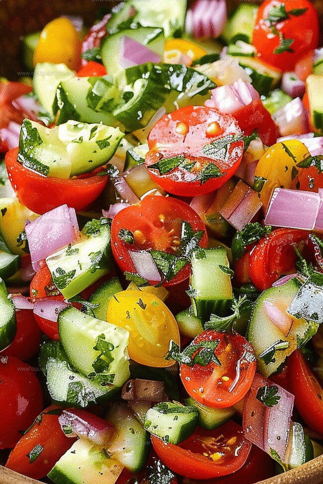Juicy tomatoes and crisp cucumbers create a light, vibrant mix that feels like sunshine on a fork.