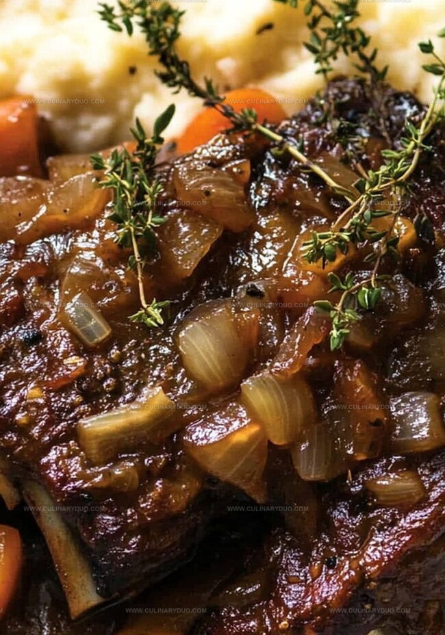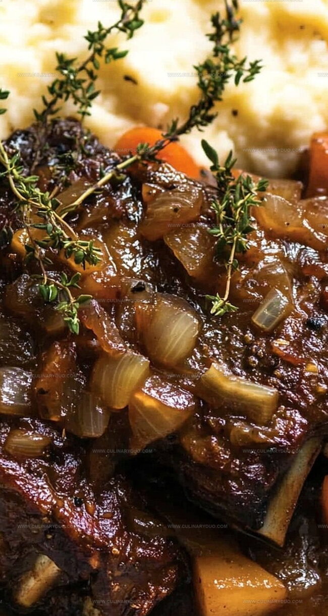 - Plate the succulent short ribs over creamy mashed potatoes, generously spooning the rich pan sauce and caramelized onions on top.