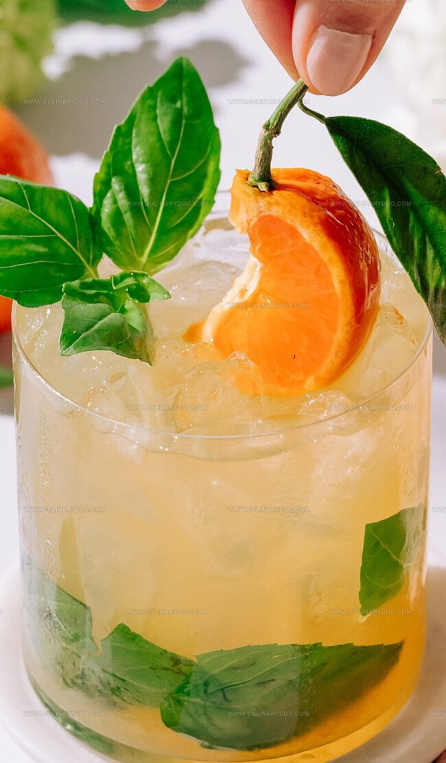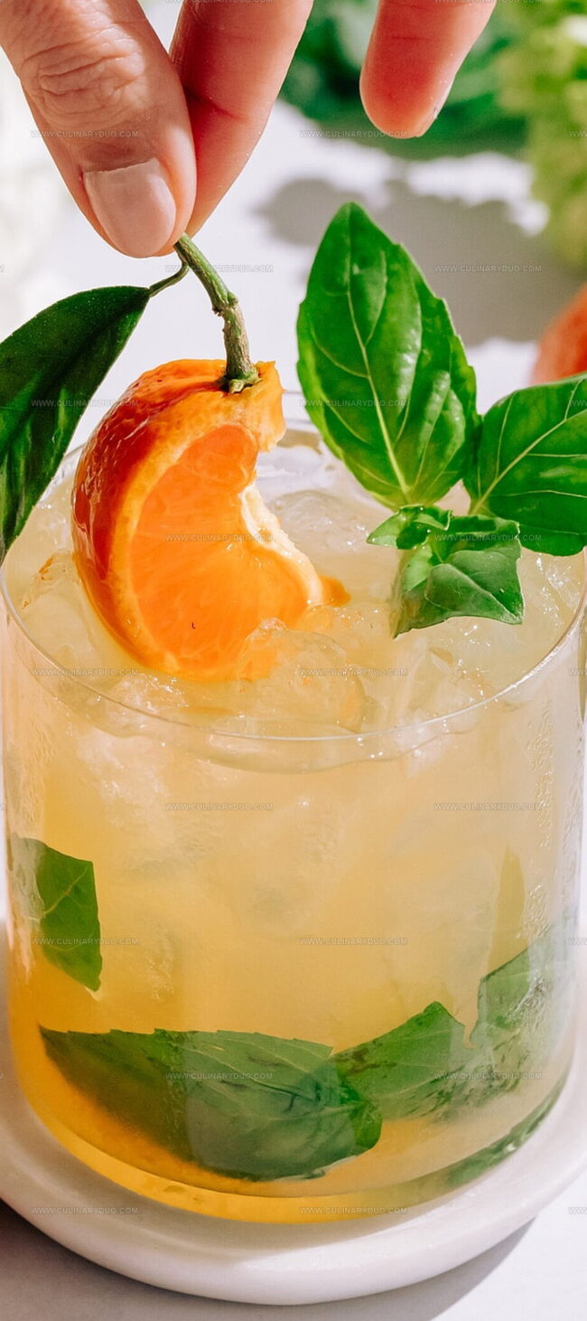 - Enhance the presentation by garnishing with a fresh basil sprig and a delicate mandarin slice on the rim.