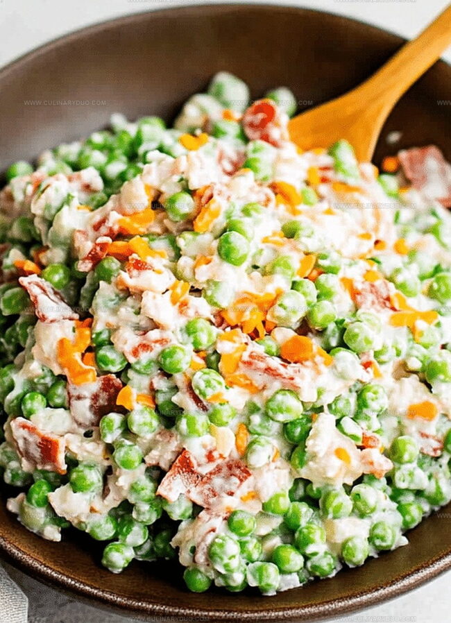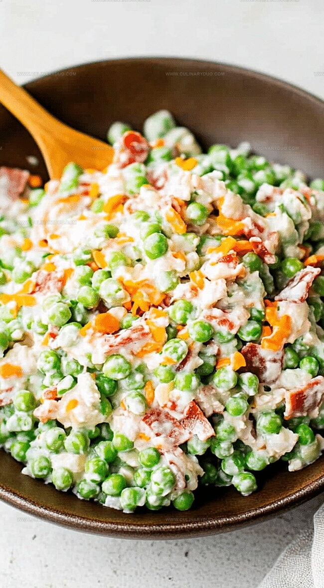 Creamy classic pea salad with bacon brings summer picnic memories to life, blending crisp vegetables and smoky bacon. Cool, tangy dressing and crunchy textures make this dish perfect for gathering friends around the table.