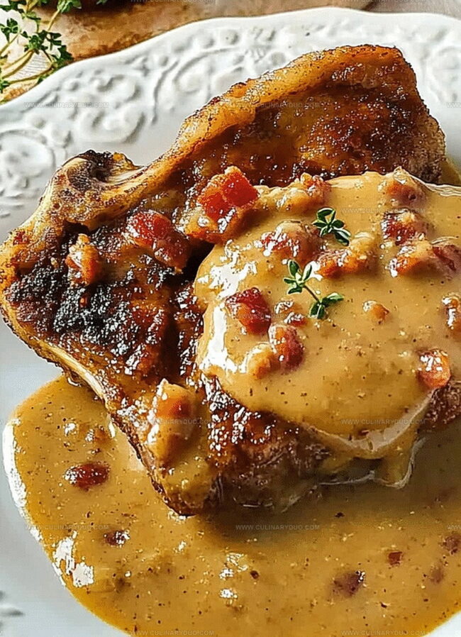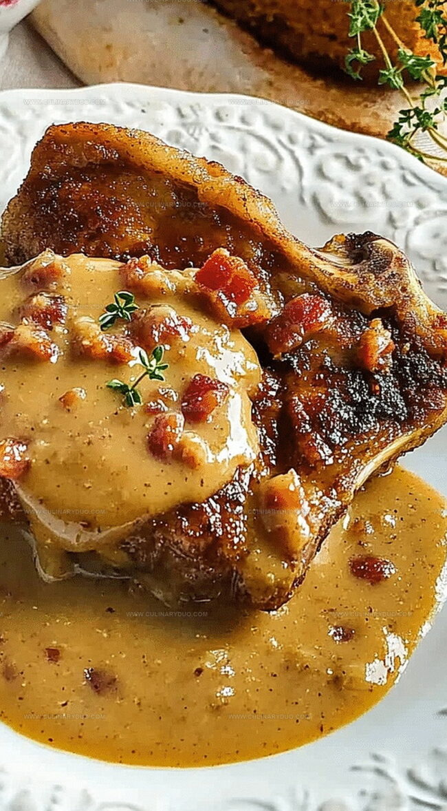 - Generously ladle the rich bacon gravy over the golden-fried pork chops, serving immediately for maximum crispiness and warmth.