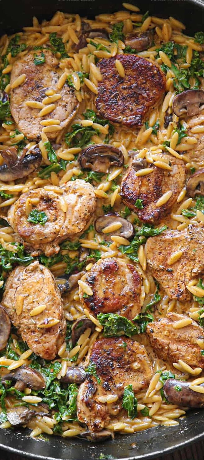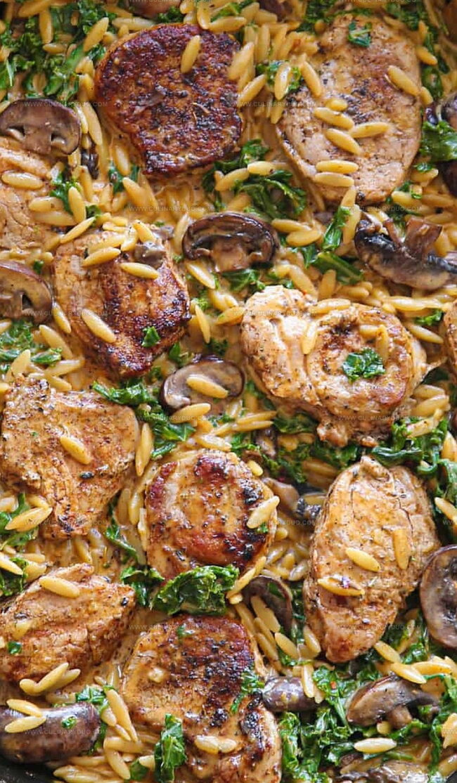 Creamy Pork Tenderloin Medallions with Orzo, Spinach & Mushrooms Recipe