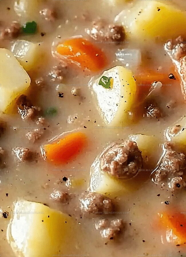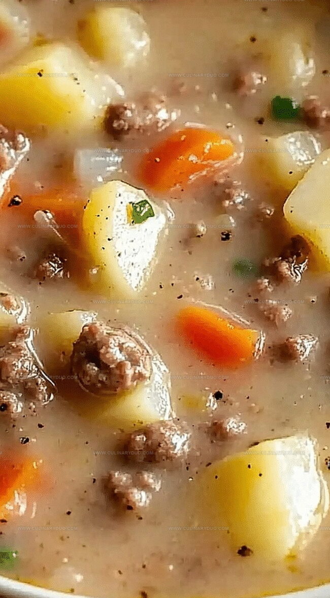 This rich and satisfying soup blends tender ground beef with soft potato chunks in a velvety broth.