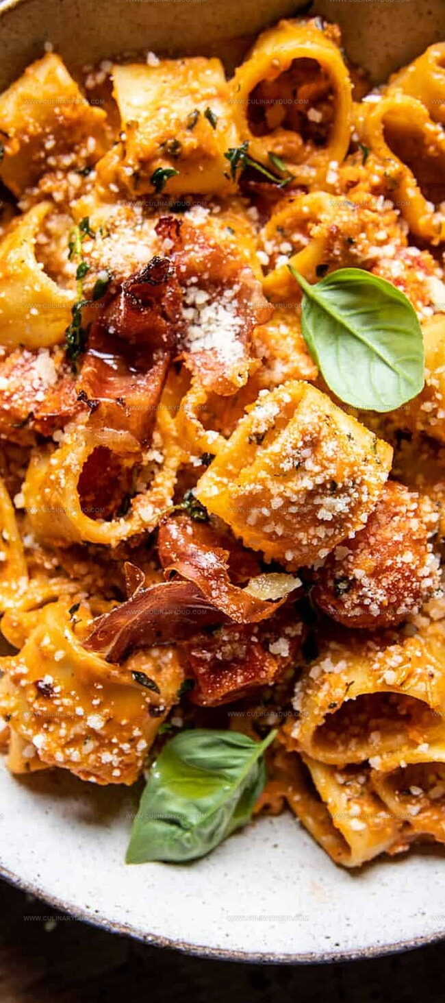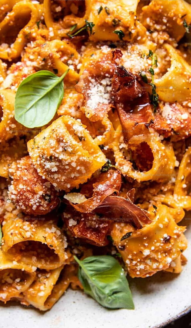 - Plate the pasta and garnish generously with additional parmesan, crispy prosciutto pieces, and fresh basil leaves for a vibrant finish.