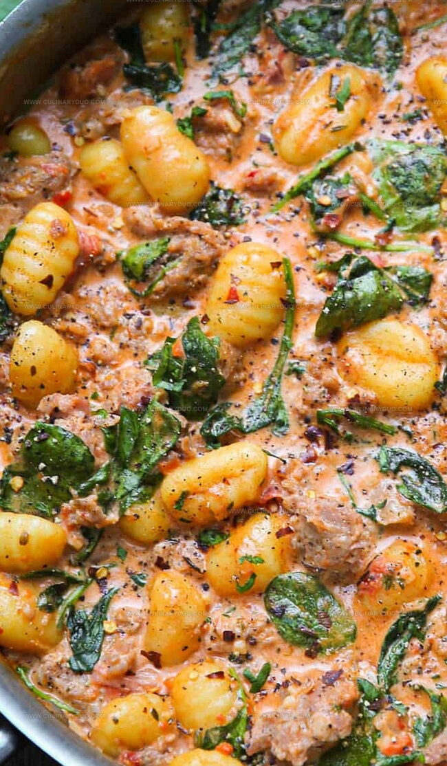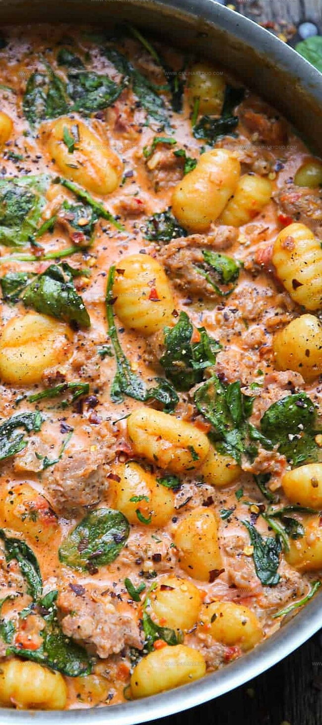 Soft potato dumplings dance with savory Italian sausage in a rich, velvety sauce.