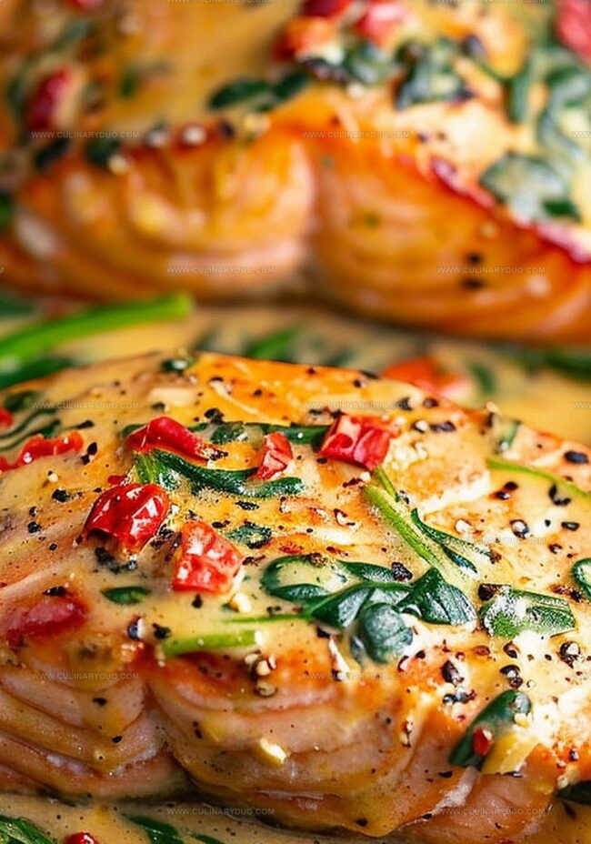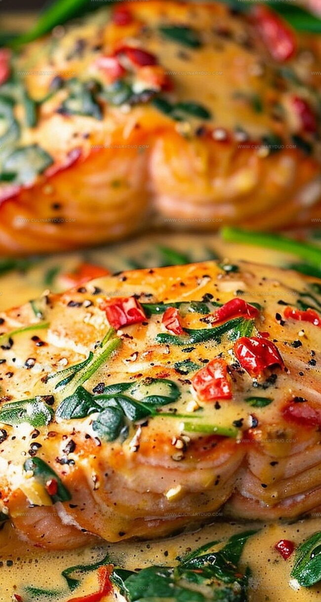 Succulent salmon meets its perfect match in this delightful creamy spinach and roasted red pepper salmon recipe that promises a flavor explosion.