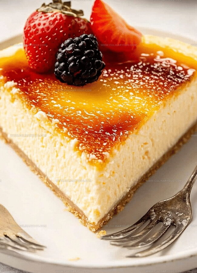 Creamy cheesecake layers blend seamlessly with the signature caramelized sugar crust of traditional creme brulee.