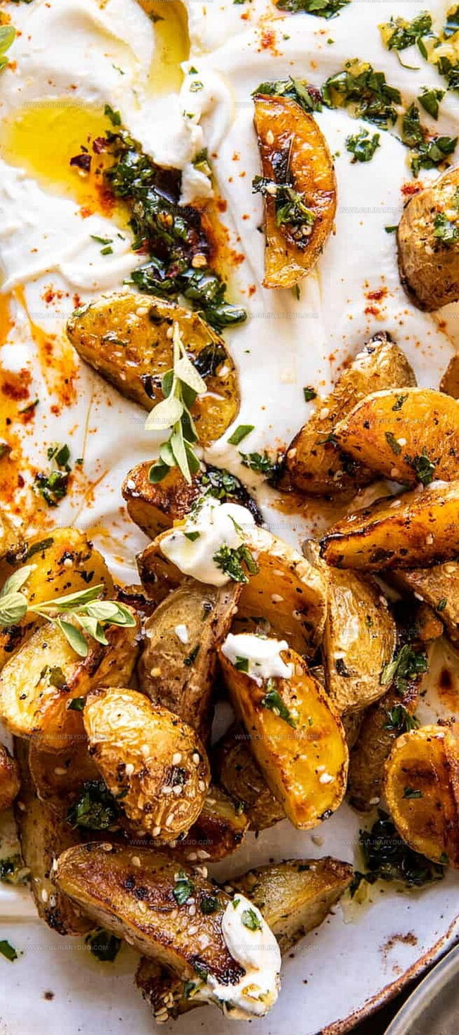 - Artfully spread feta sauce across serving plate, arranging crispy potatoes atop the creamy base.