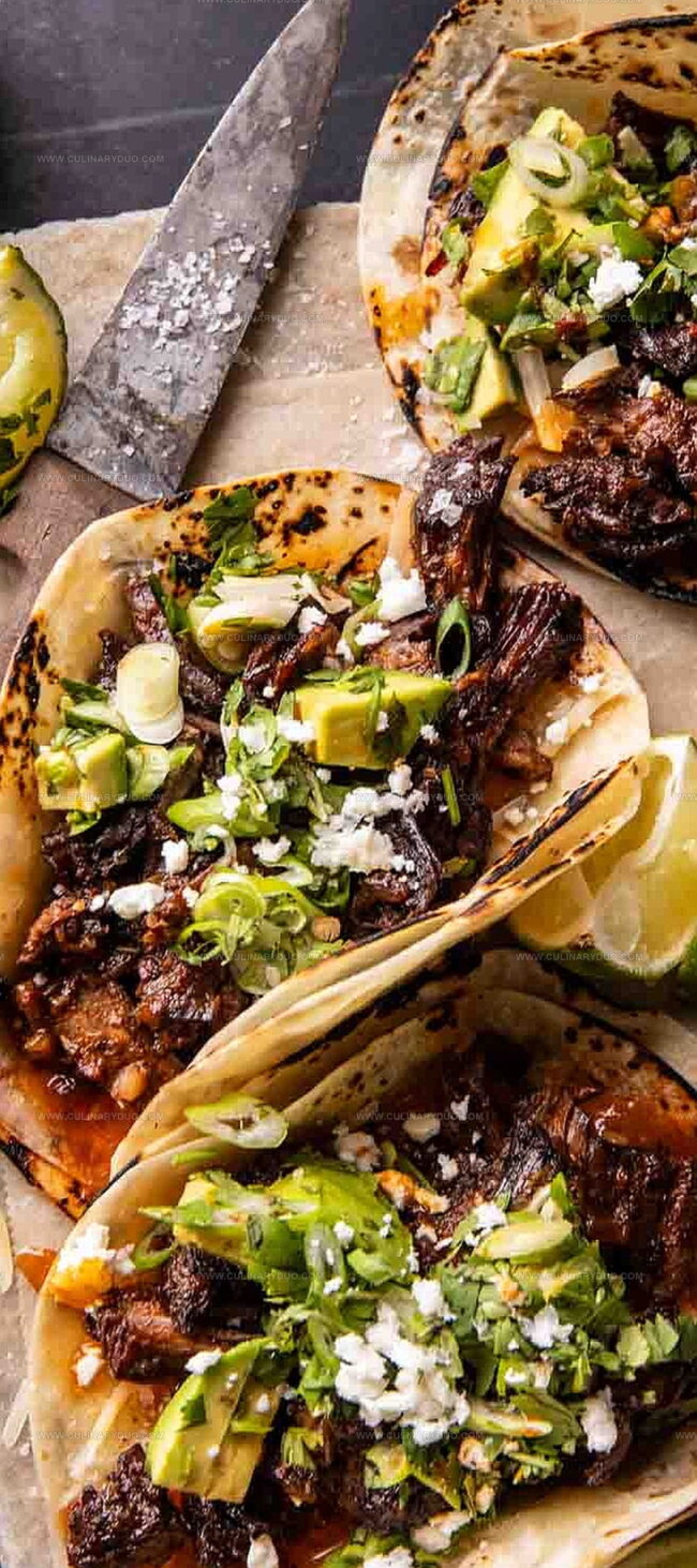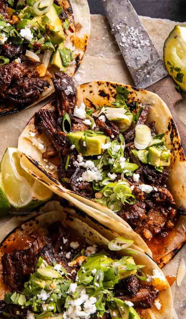 - Assemble tacos by filling shells with shredded beef and caramelized onions.