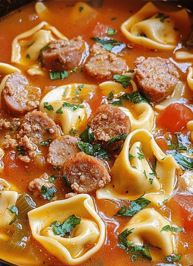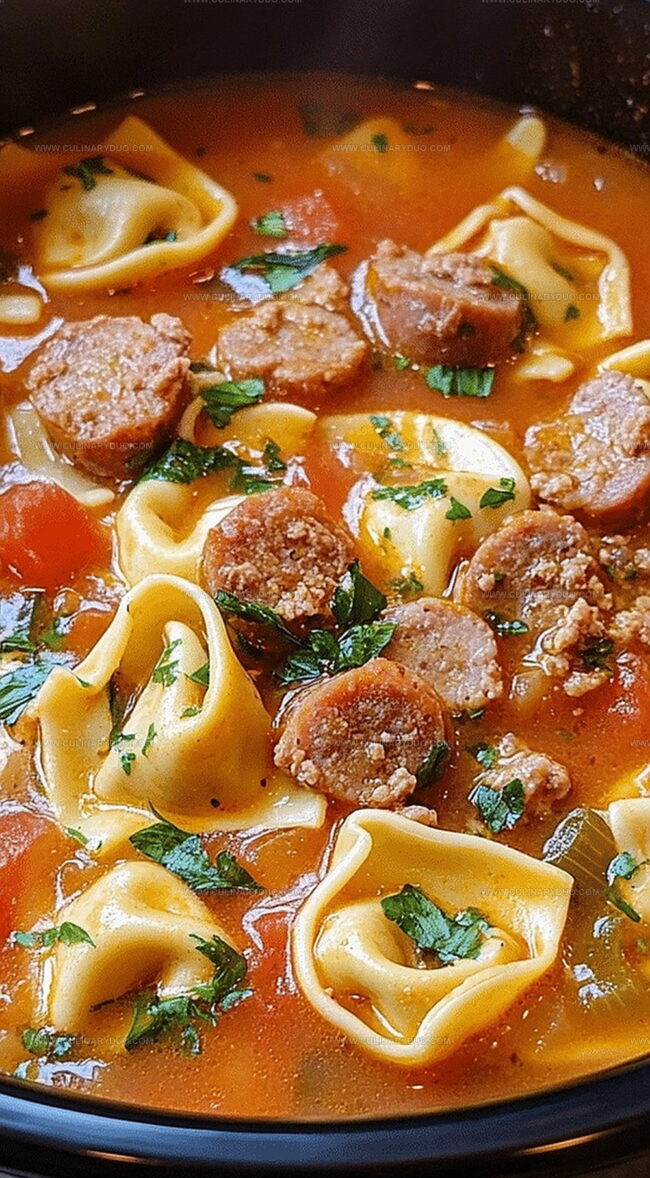 Tender cheese-filled pasta swirls through a rich, savory broth packed with robust Italian sausage and tender vegetables.