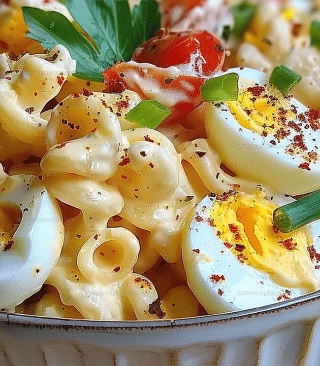 Creamy deviled egg pasta salad brings classic picnic flavors together in one irresistible dish. Cold macaroni mixed with tangy mayo, mustard, and chopped eggs creates a crowd-pleasing summer classic you’ll crave at every potluck.
