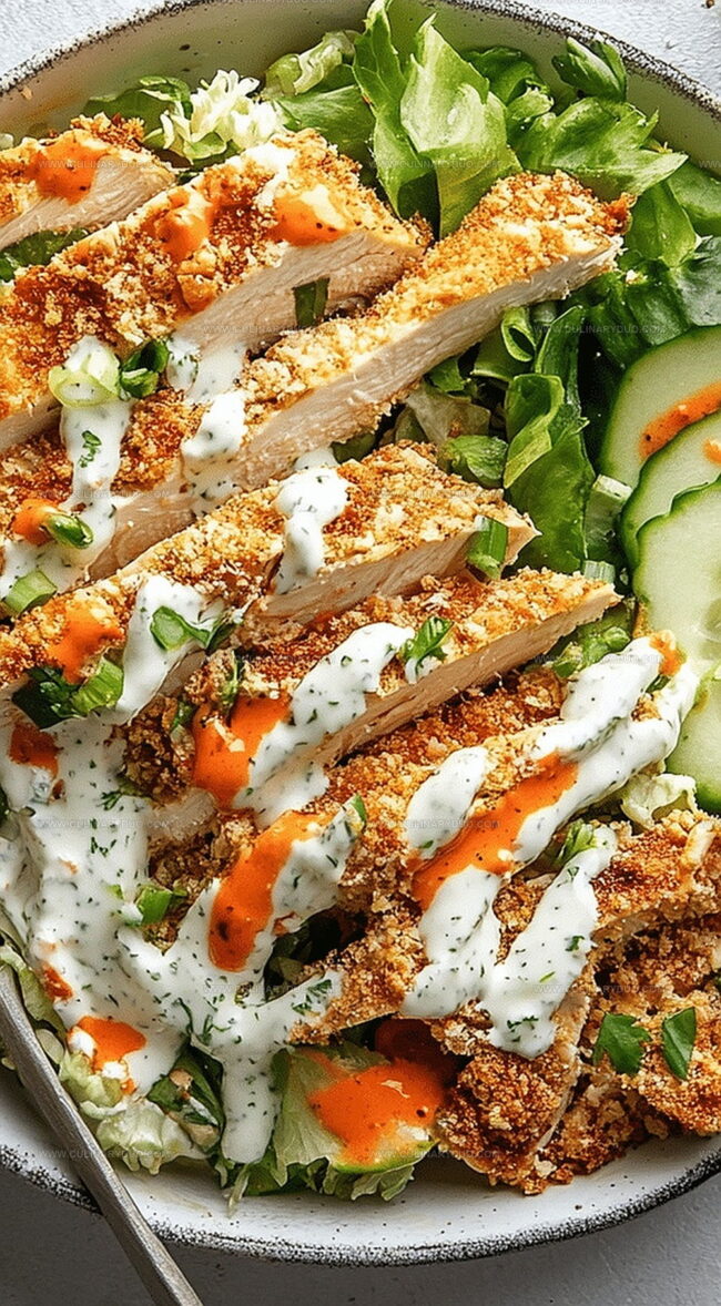 - Carefully arrange Buffalo-sauced chicken on top of the salad, creating an appealing presentation.