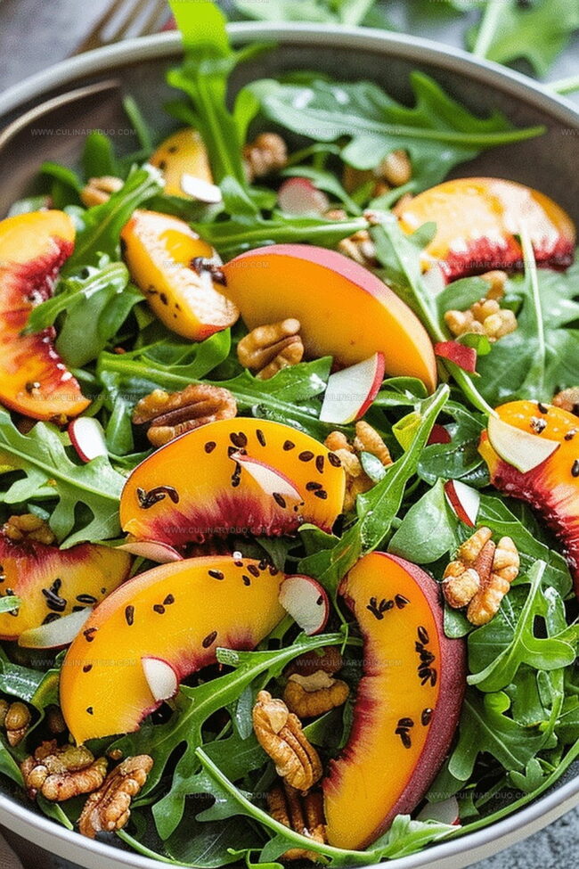 Sweet stone fruits mingle beautifully with peppery greens, creating a refreshing culinary experience.